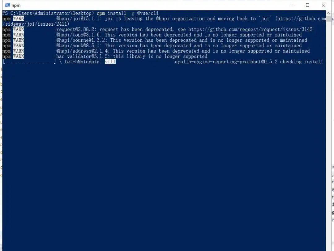 PS C:UsersAdministratorDesktop> npm install -g @vue/clinpm WARN deprecated @hapi/joi@15.1.1: joi is leaving the @hapi organization and moving back to 'joi' (https://github.com/sideway/joi/issues/2411)npm WARN deprecated request@2.88.2: request has been deprecated, see https://github.com/request/request/issues/3142npm WARN deprecated @hapi/topo@3.1.6: This version has been deprecated and is no longer supported or maintainednpm WARN deprecated @hapi/bourne@1.3.2: This version has been deprecated and is no longer supported or maintainednpm WARN deprecated @hapi/hoek@8.5.1: This version has been deprecated and is no longer supported or maintainednpm WARN deprecated @hapi/address@2.1.4: This version has been deprecated and is no longer supported or maintainednpm WARN deprecated har-validator@5.1.5: this library is no longer supported[..................] / loadDep:sha.js: sill resolveWithNewModule apollo-env@0.6.5 checking installable status
