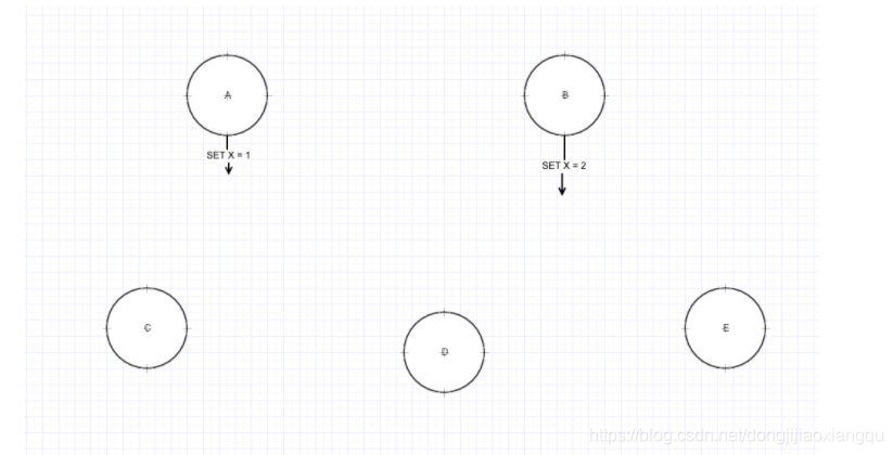 然后5个节点都可接受读写请求, 这时候有客户端要连入这些节点了, 然后客户端想设置一个 值 SET X , 假设 客户端 1 连入了 A 节点, 发出命令 SET X = 1, 客户端2 连入了 B节点, 发出命令 SET X = 2, 那么我们来看看会发生什么过程。