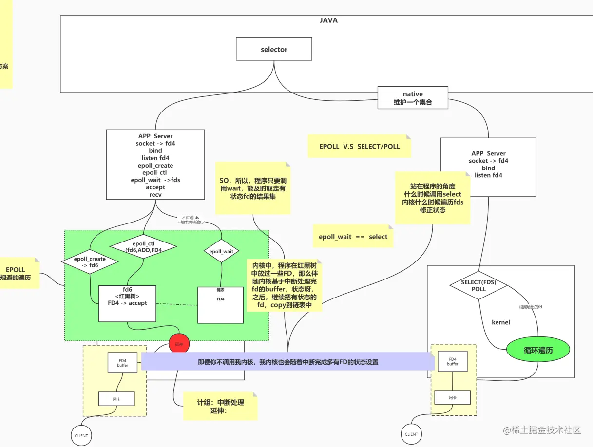 // NIO 自己对着每一个fd调用系统调用,浪费资源,那么你看,这里是不是调用了一次select方法,知道具体的那些可以R/W了?