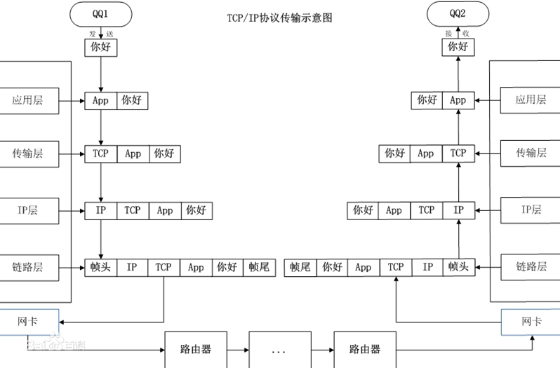 根据以上概念以及 TCP/IP 四个层的介绍,我们可以来看看网络传输中 TCP/IP 协议到底是怎样一步一步地将数据进行传输的。