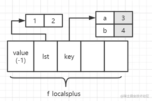 f(-1,1,2,a=3,b=4)调用函数后,PyFrameObject对象中f_localsplus的结构如下