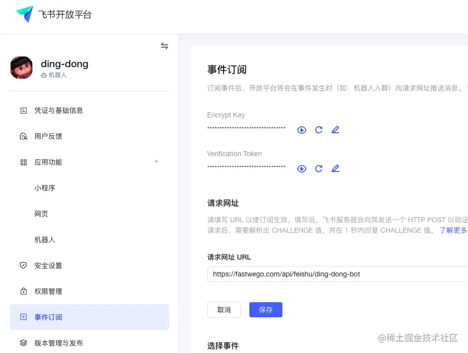配置机器人 回调 url ,获取 EncryptKey 和 Token