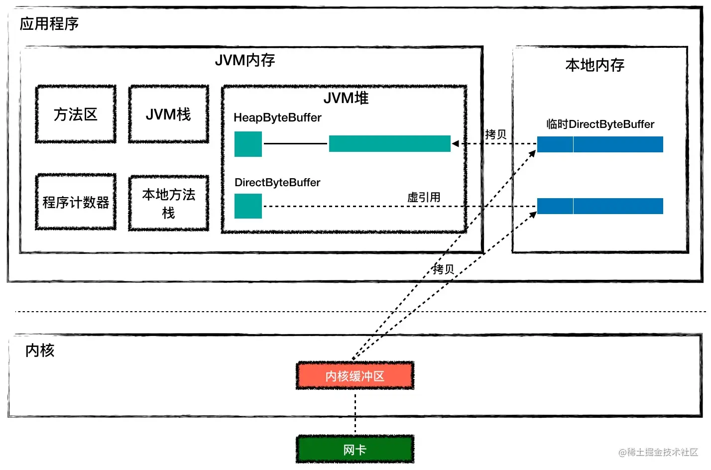 这是为什么呢?这是因为数据从内核拷贝到 JVM 堆的过程中,JVM 可能会发生 GC,GC 过程中对象可能会被移动,也就是说 JVM 堆上的字节数组可能会被移动,这样的话 Buffer 地址就失效了。如果这中间经过本地内存中转,从本地内存到 JVM 堆的拷贝过程中 JVM 可以保证不做 GC。