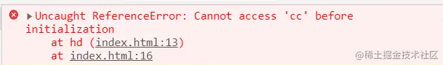 - 这里还涉及到作用域链的问题,当我们打印cc的时候,先会在hd()函数作用域里面找cc。如果找不到,就会向上一次去寻找,直到找到全局作用域,还没有找到,就宣布找不到。
