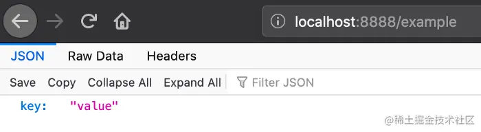 成功了! 服务器为路由/example返回了一个JSON键值对。当浏览器访问一个地址时,他们在幕后提出了一个GET请求。在下一节中,你不仅会提出和处理更多的GET请求,还会提出POST、PUT和DELETE请求。