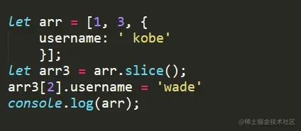 如果该元素是个对象引用(不是实际的对象),slice 会拷贝这个对象引用到新的数组里。两个对象引用都引用了同一个对象。如果被引用的对象发生改变,则新的和原来的数组中的这个元素也会发生改变。 对于字符串、数字及布尔值来说(不是 String、Number 或者 Boolean 对象),slice 会拷贝这些值到新的数组里。在别的数组里修改这些字符串或数字或是布尔值,将不会影响另一个数组。