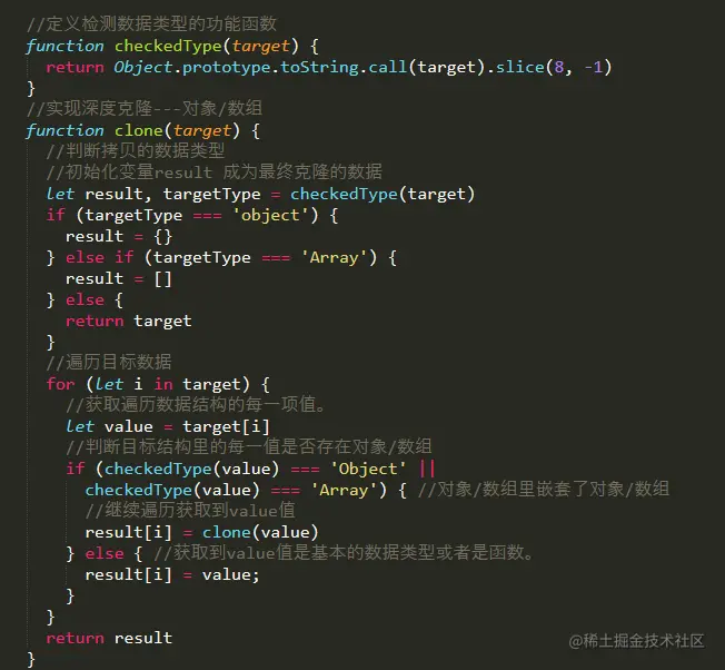 递归方法实现深度克隆原理:遍历对象、数组直到里边都是基本数据类型,然后再去复制,就是深度拷贝