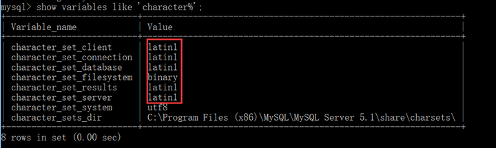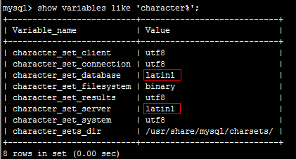 可以看出数据库安装之后,默认的配置字符串是latinl格式的,而我们建库建表时,使用的是utf8字符,这就导致了项目中mysql sdk在持行insert时,会出现数据乱码,我们只要把数据库默认编码改成utf8字符,即可解决此类问题。