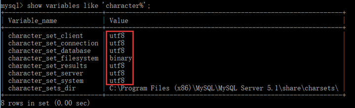 假如,我们的后台获取的数据都是正常的utf8字符,我们的表以及数据库在创建的时候,也是设置为utf8的字符集,但是在我们后台持行insert的时候,发现进入数据库的数据是乱码,这时候,我们就可以确定,数据库的字符不对,我们可以使用以下命令去查看。
