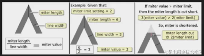 miter length 尖角长度,miter value > miter limit限制的话,就会把超出部分裁剪掉,没超出就不会被裁剪