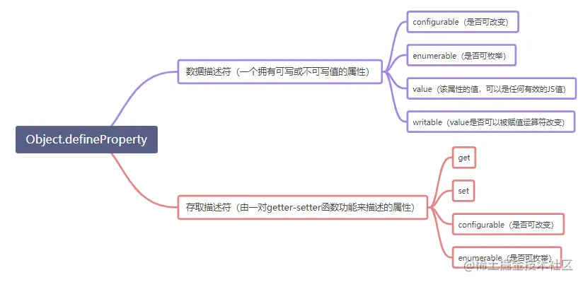 这里根据 MDN 上,将defineProperty可以定义的两类属性分别分析下,一个是数据描述符、一个是存取描述符,并且这两种形式是不可以混用的。他们有共有属性和特有属性,我们下面都单独理一下。
