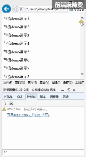 我们可以看到,当持续触发scroll事件时,事件处理函数handle只在停止滚动1000毫秒之后才会调用一次,也就是说在持续触发scroll事件的过程中,事件处理函数handle一直没有执行。