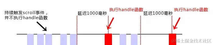 函数节流(throttle):当持续触发事件时,保证一定时间段内只调用一次事件处理函数。节流通俗解释就比如我们水龙头放水,阀门一打开,水哗哗的往下流,秉着勤俭节约的优良传统美德,我们要把水龙头关小点,最好是如我们心意按照一定规律在某个时间间隔内一滴一滴的往下滴。如下图,持续触发scroll事件时,并不立即执行handle函数,每隔1000毫秒才会执行一次handle函数。