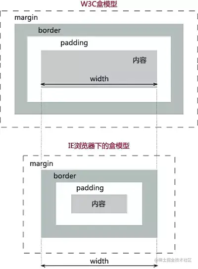 盒子模型有两种:W3C标准盒子模型和IE盒子模型,标准盒子模型(box-sizing:content-box),内容宽高是内容的大小,IE盒子模型(box-sizing:border-box),内容宽高为:内容大小+padding+border
