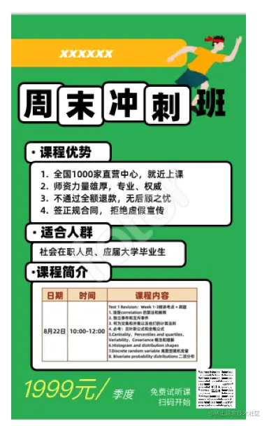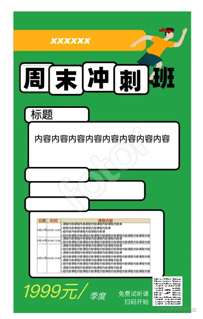 他说:”现在有个需要根据后端生成的数据,生成自定义的海报,后期可以简单的编辑,数据分为描述信息,二维码和表格信息”(虽说我是个前端,因为我们后台前后端没分离,而且仅剩的俩个前端还在干需求...)。