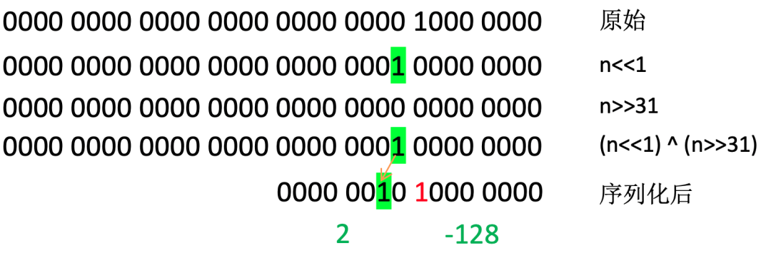 比如我们要存储一个 int 类型的 128 ,4个字节,转换后只需要两个字节存储。