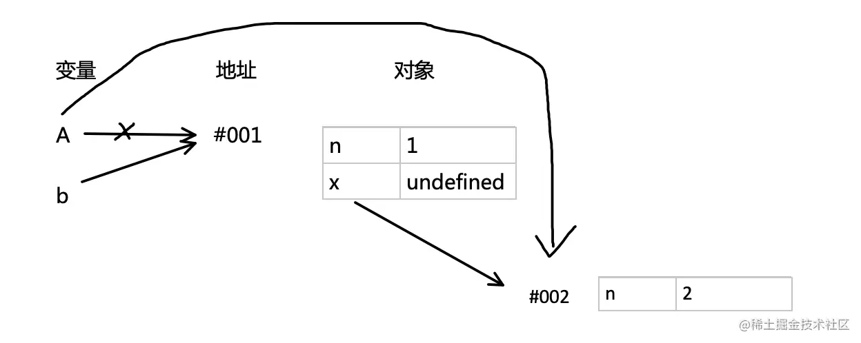 赋值运算符是右关联性的,所以执行a = { n: 2 }(step2),这时候a的地址发生了变化,指向了新地址#002,因为b还保留着a的旧地址,所以旧地址没被释放掉。