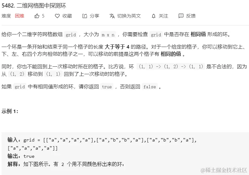 判断环需要dfs,对于所有格子,沿着和他(值)相同的格子进行深度优先搜索,同时记录格子是否被访问过,如果某个时刻,沿着和相同的 格子搜索的时候找到了一个之前访问过的格子,说明存在环;而如果下一个格子和当前格子(值)相同,但是没访问过,就从下一个格子继续往后 搜素,直到找到了环或者没有和格子的值相同的格子可以继续搜索为止。