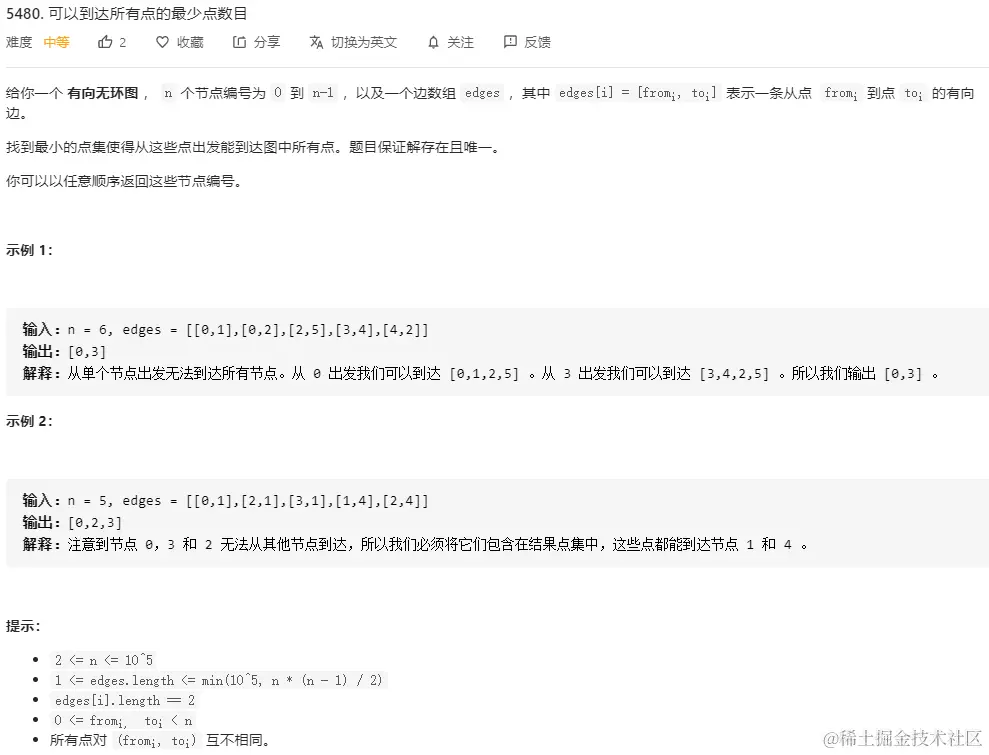 首先,对于所有入度为0的点,由于没有边可以到达这个点,所以我们是一定要把它们加入到答案中的, 然后,由于题目给的是有向无环图,所以所有点一定都是从一个入度为0的点到达的,所以入度大于0的点,无需加入到 答案中,因为答案中已经有了所有入度为0的点,从某个入度为0的点出发,肯定可以到达这个点。 所以问题就转换为,找出所有入度为0的点。