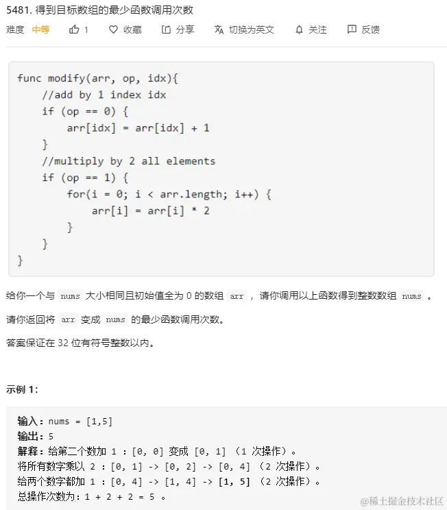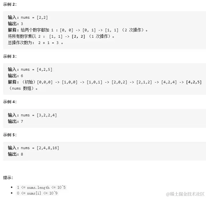 我们考虑把nums数组变成全0数组,这个操作是把全0数组变成nums数组的逆向操作,所以操作次数是一样的。