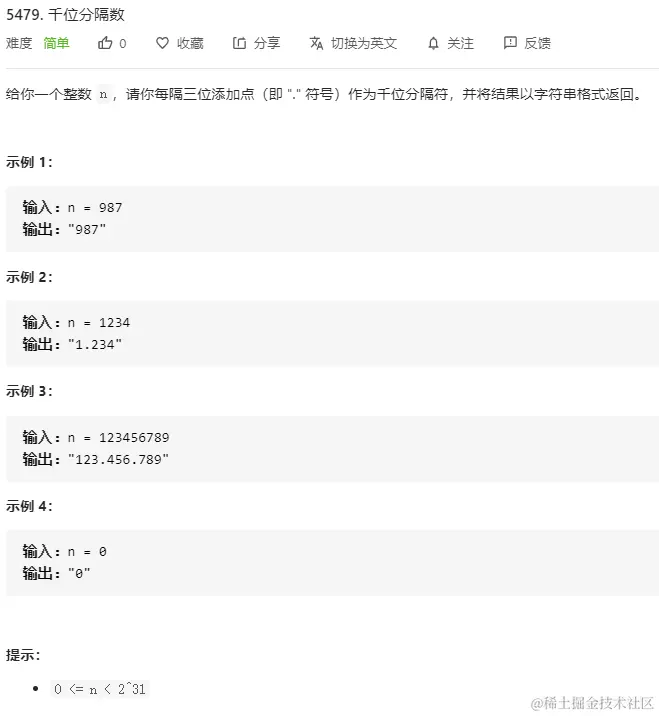把数字转换成字符串并翻转,然后每三位加一个".",之后再翻转字符串,就是最终的答案了。