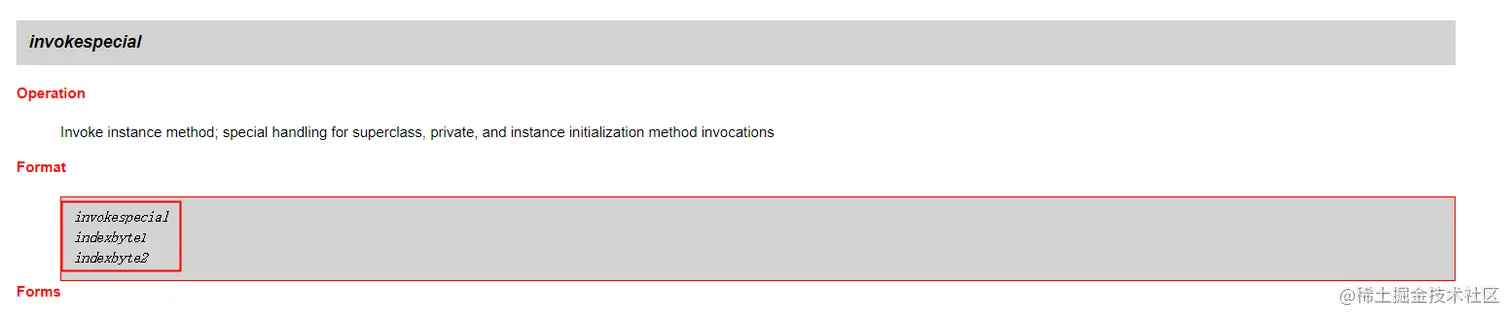 通过查阅官方文档,我们可以知道,使用invokespecial这个指令时,需要带两个参数的。所以下一个字节码的偏移量=1+1+2=4。即“4: return”中所对应的偏移量。当然,一般来说,不需要我们自己去计算偏移量的。这里只是通过官方文档,来满足我们小小的好奇心而已哈哈!
