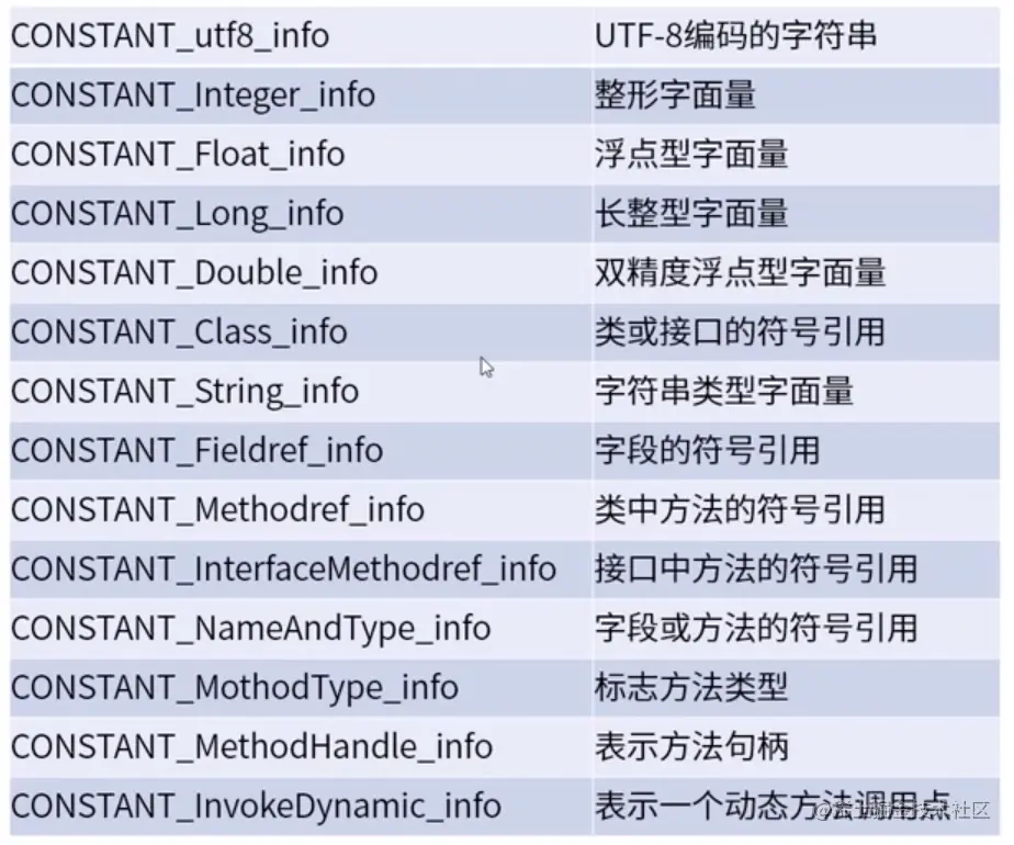 这里存放的是类信息包含的静态常量,编译之后就能确认。这里使用的标识所对应的含义,参见下表。