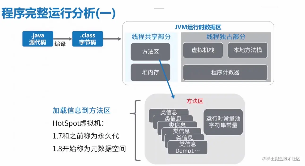 由上图可知,java源代码经过编译,形成class字节码文件。JVM在在加载类时,会将类信息、运行时常量池、字符串常量等都加载到方法区中。对于HotSpot虚拟机来说,1.7以前,方法区是存放在永久代中的,从1.8开始,方法区开始被称为元数据空间。