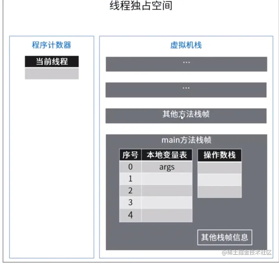 线程在运行时,需要在程序计数器开辟小小的空间,用来记录当前线程执行代码的位置。同时需要在虚拟机栈开辟一个空间。每个线程对应的一个虚拟机栈。一个虚拟机栈对应着多个栈帧。栈帧是方法对应的操作。其实main方法是程序的入口。main方法栈帧中包含本地变量表和操作数栈。下面我们就来分析上面main方法的执行过程。