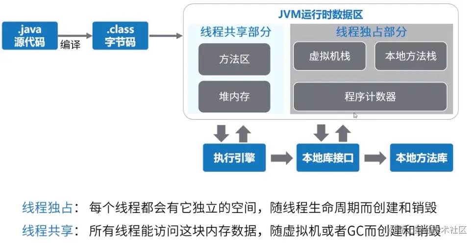 如上图所示,java代码经过编译之后,产生了class文件。java程序运行时,JVM会为class文件分配一个内存空间,存储它运行时的信息,即JVM运行数据区。JVM运行数据区按照线程是否独占或共享,进一步划分为若干个不同的数据区域。其中,线程共享部分包括方法区和堆内存,线程独占部分包括虚拟机栈、本地方法栈、程序计数器。