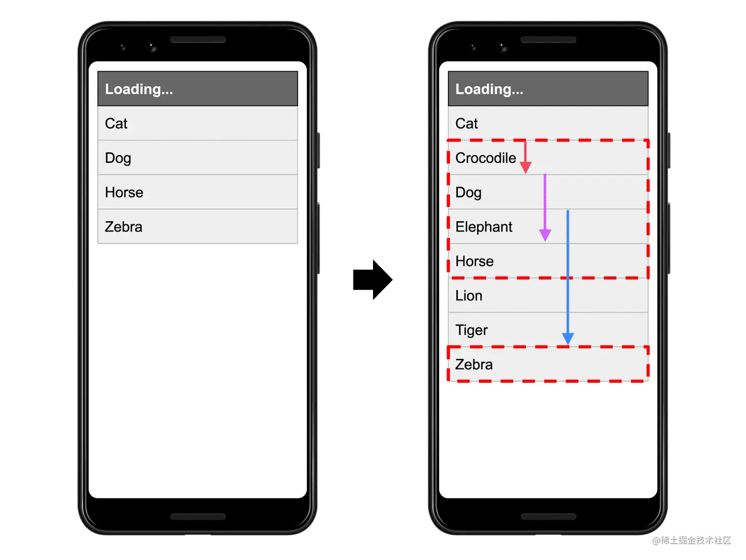 第一个元素 "Cat" 前后没有改变起始位子,所以是稳定的。同样,新加入的元素,也是稳定的。只有 "Dog", "Horse", "Zebra" 这三个元素改变了起始位子,是不稳定元素。