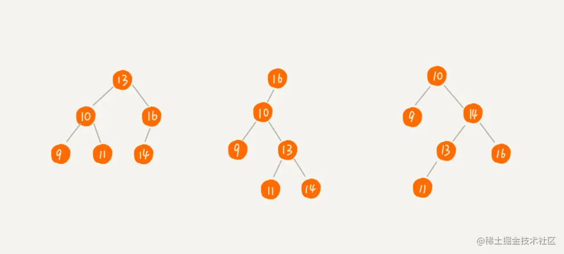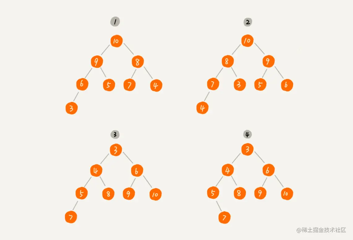 其中第 1 个和第 2 个是大顶堆,第 3 个是小顶堆,第 4 个不是堆。除此之外,从图中还可以看出来,对于同一组数据,我们可以构建多种不同形态的堆。