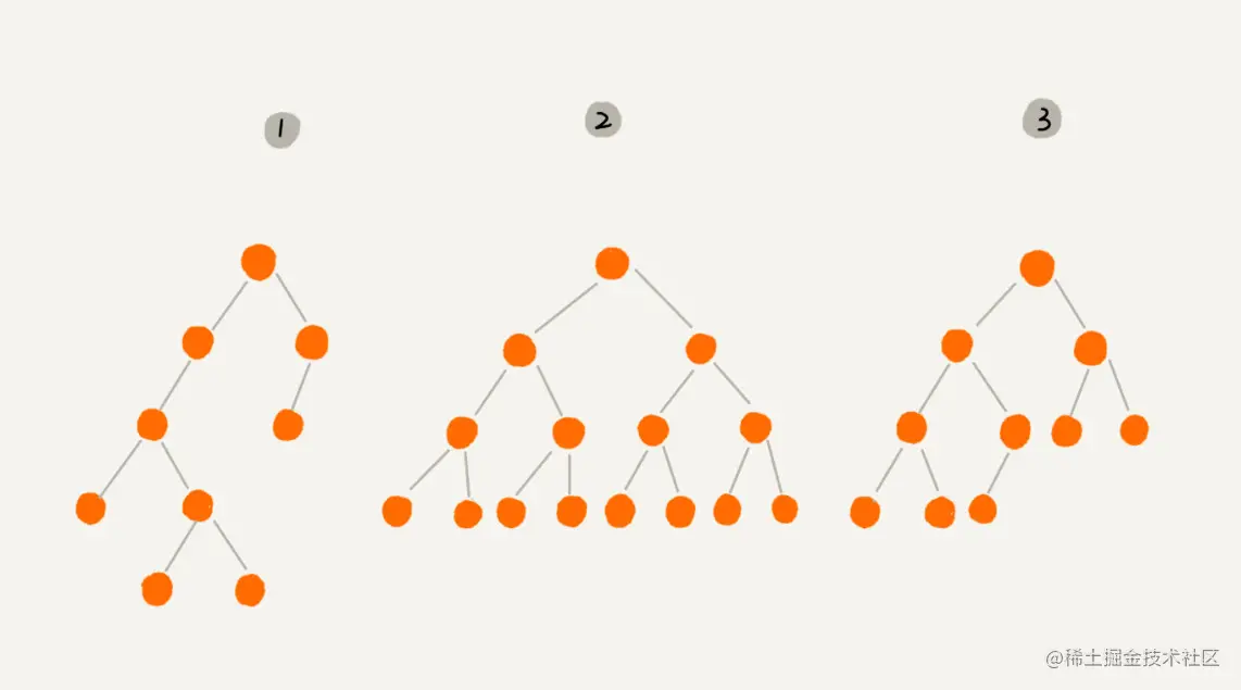 编号 3 的二叉树中,叶子节点都在最底下两层,最后一层的叶子节点都靠左排列,并且除了最后一层,其他层的节点个数都要达到最大,这种二叉树叫做完全二叉树。