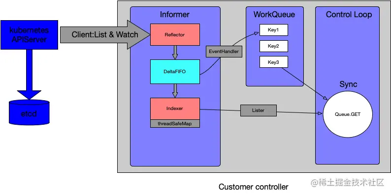 上图展示了自定义控制器的流程图,控制器通过APIServer获取自定义对象或内置对象的变化。感知这种变化需要该对象的