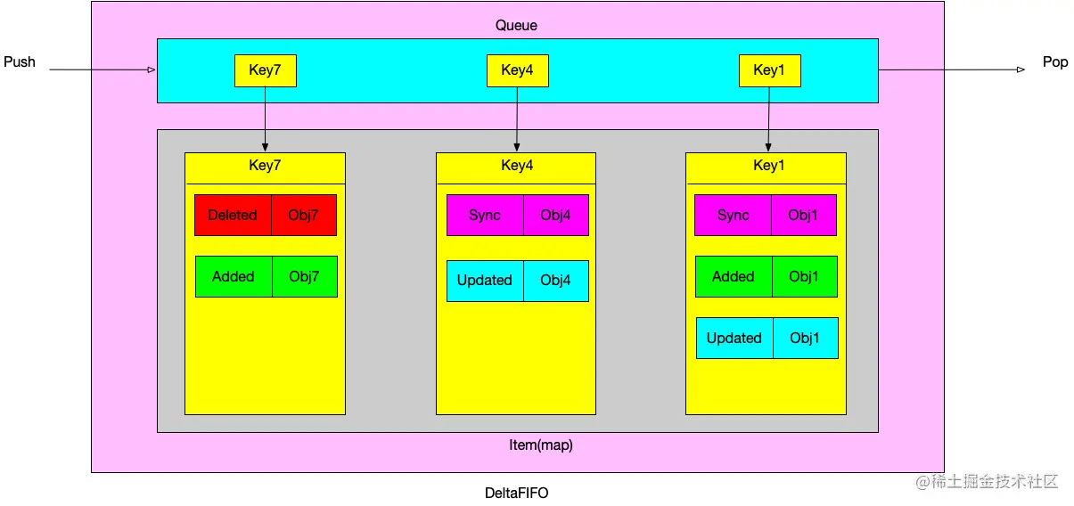 其中主要用到的数据结构就是items和queue,可以简单的分析一下队列的添加方法就大概能明白DeltaFIFO是如何存储数据的。队列元素删除、新增、更新最后都会执行如下方法: