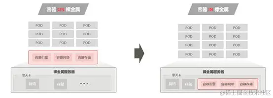 当前,第一代裸金属容器基于“容器 ON裸金属”架构,相比传统”容器 ON 虚拟机”,带来业务性能提升和成本优化,已成为业界的通用架构,但容器组件依然运行在服务器上,占用大量资源。