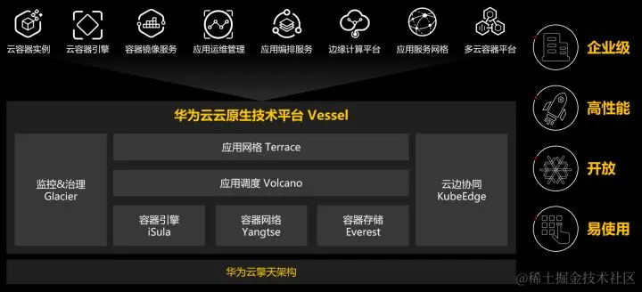 华为云云原生技术平台Vessel涵盖以容器引擎、容器网络、容器存储为核心的基础设施技术层,结合华为云擎天架构软硬协同的技术优势,能充分释放华为云基础设施的性能潜力,为业务提供高性能的运行平台。