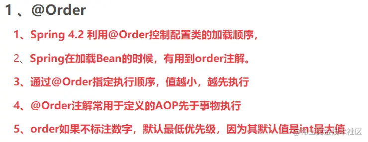 @Order标记从spring 2.0出现,但是在spring 4.0之前,@Order标记只支持AspectJ的切面排序。spring 4.0对@Order做了增强,它开始支持对装载在诸如Lists和Arrays容器中的自动包装(auto-wired)组件的排序。