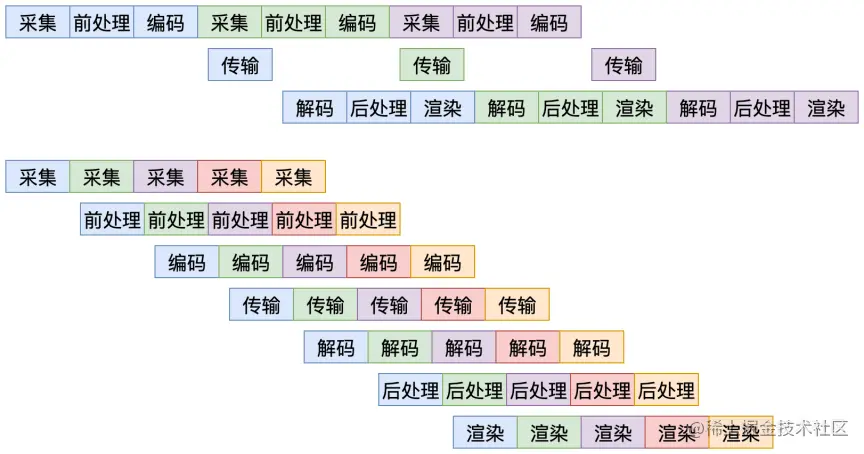 下图上下两部分是两个极端,上半部分粒度很粗,采集、前处理、编码一起做完给传输,对端解码、后处理、渲染也一口气做完。这样做,在设备性能好的情况下,延迟是可以比下面的流水线实现低的,但是吞吐是有问题的;
