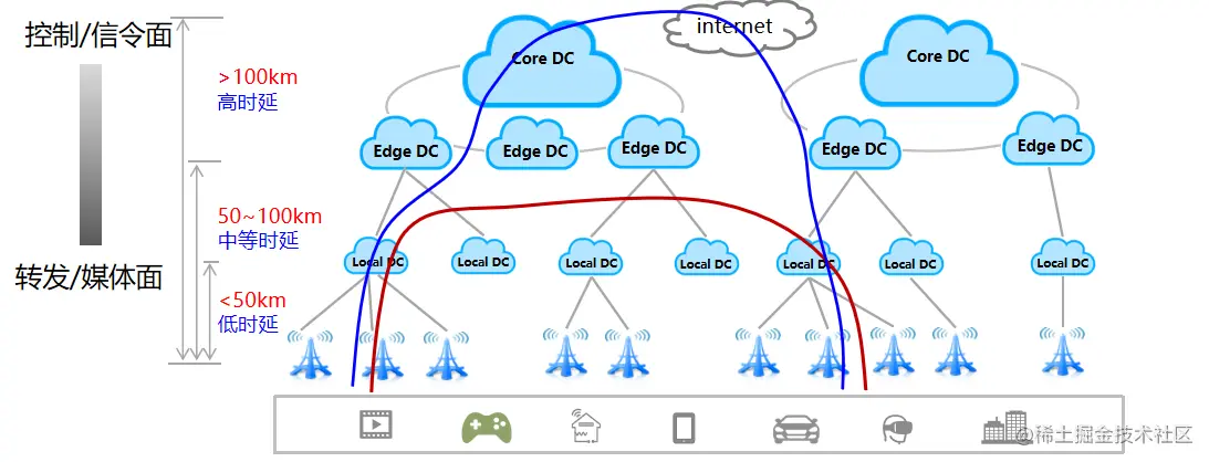 即构很期待5G的到来和铺开的,首先我们方案是转控分离的,我们的信令面和媒体转发面是分开的,转发面我们就可以从一个localDC到另一个localDC,不需要再往上面去扩,这样更靠近用户走更短的路径,有时延的优化;第二是我们控制面是有状态的,那我们还是往上走,控制面并不影响数据的延迟。