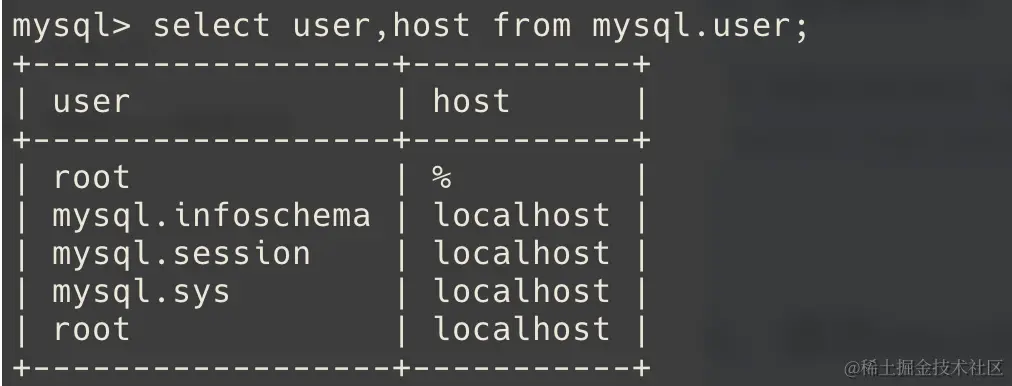 # 查看目前的账号 有%的root账号表示远程登录账号配置成功