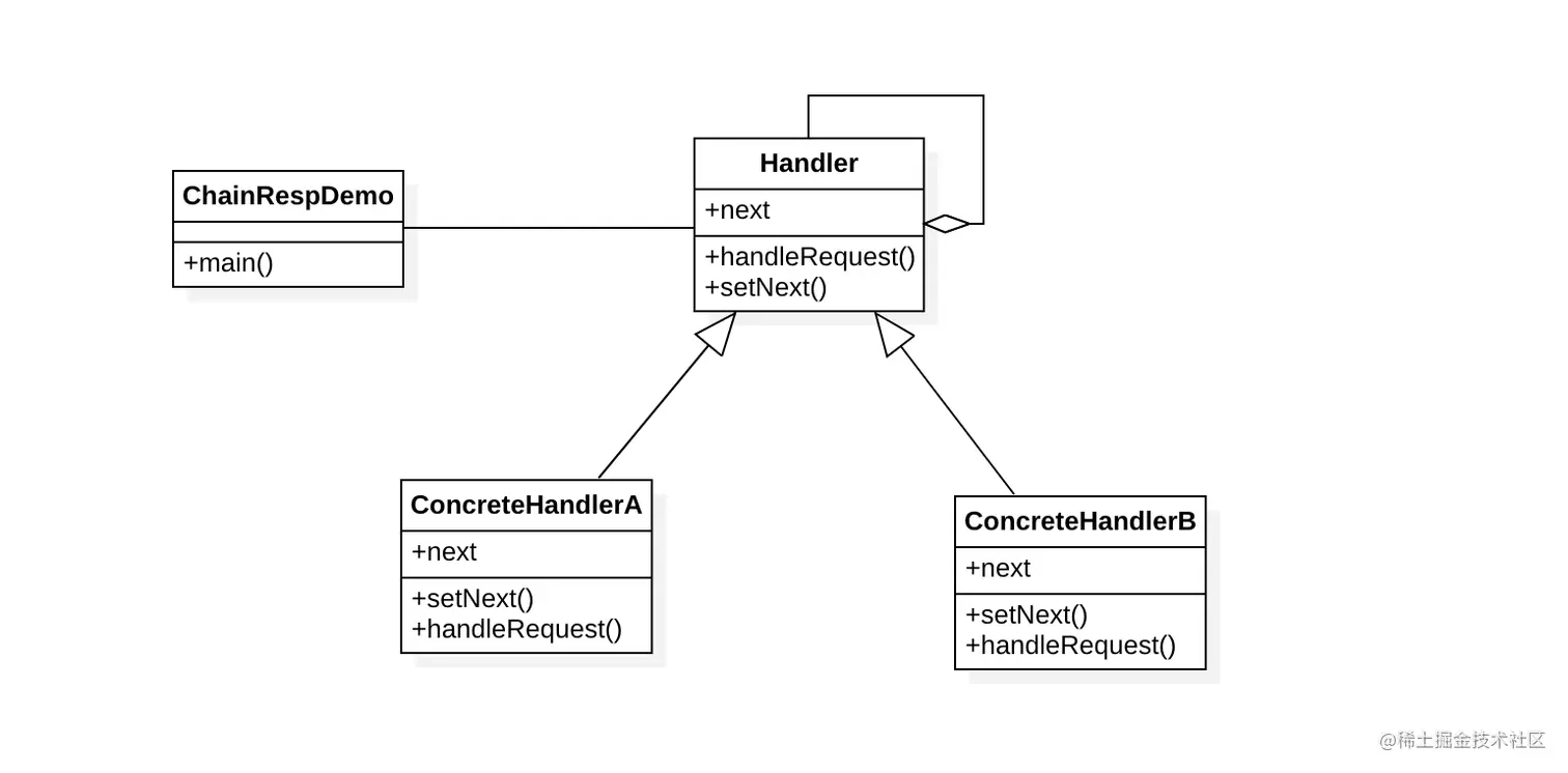 链条的结构并不是在具体处理类中的,具体处理类只是一个未被初始化的该处理者的下一个处理者的引用。真正初始化这个职责链条是在外部进行的。