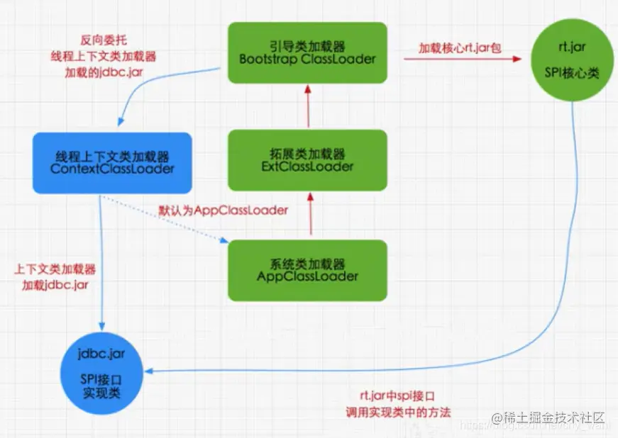 有了这个上下文类加载器,就可以去加载所需要的SPI代码,实际上就是从父类加载器去请求子类加载器去完成类的加载驱动,违背了双亲委派的一般性规则。Java中所有涉及SPI的加载动作基本上都采用这种方式,例如JNDI、JDBC、JCE、JAXB和JBI等。!