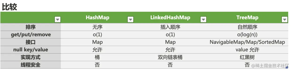 HashMap、LinkedHashMap、TreeMap 都实现了 Map 接口,并提供了几乎相同的功能(增删改查)。它们之间最大的区别就在于元素的顺序: