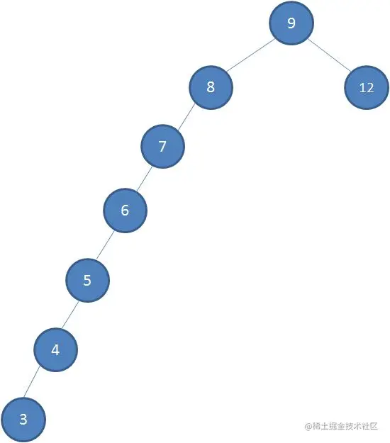 理解二叉查找树了吧?不过,二叉查找树有一个不足,就是容易变成瘸子,就是一侧多,一侧少,就像下图这样:
