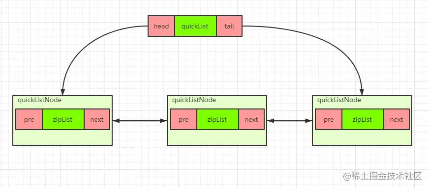 快速列表结构是Redis在3.2版本后新加的,链表对每个节点增加pre和next字段,且存在较大的内存碎片化,新增快速链表quickList,实际上是 zipList 和 linkedList 的混合体,把多个节点组成zipList,多个zipList组成大的链表节点quickListNode,形成链表,这样只需要在每个quickListNode节点上增加pre和next指针,节约内存及减少了内存碎片化。