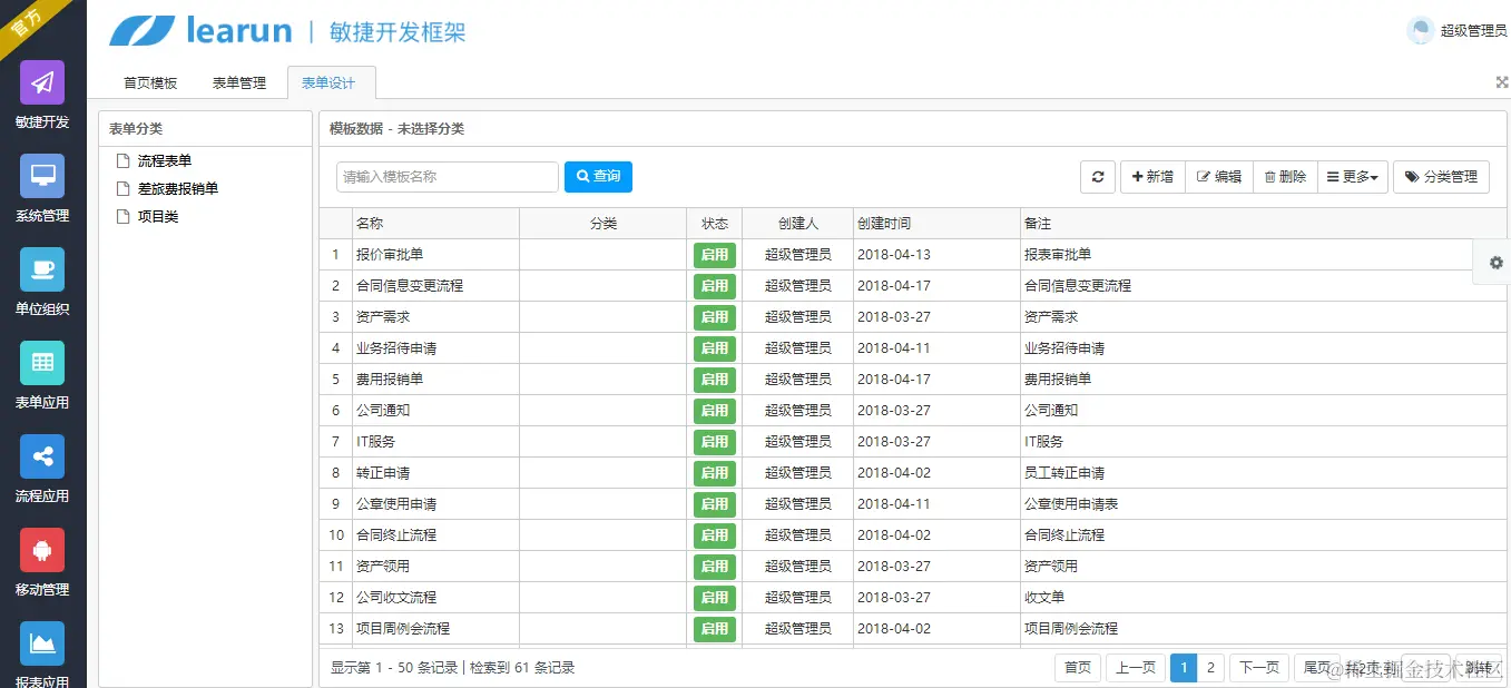 这是一套高效快捷的可视化的流程设计工具,开发引擎中有包括表单设计、流程设计、流程管理、流程日志在内的多个模块。用户可以通过拖拉点拽等可视化操作来绘制流程,仅使用鼠标即可对于环节处理、环节表单、环节参与者进行详细配置。使用这一类高容错率和高透明度的设计方式,将从根本上消除开发过程中出错的可能。