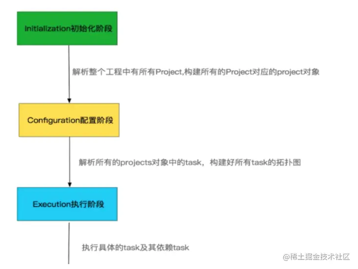 初始化阶段 其实对应的就是我们的settings.gradle 文件。 配置阶段 就是主要目的就是为了构建出我们的 task和task之间的依赖关系 也就是谁先执行 谁后执行的 有向无环图。 执行阶段 就是整个gradle 最终 build 你project的 阶段了