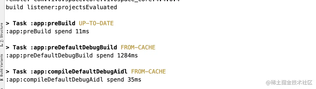 有了上述的基础,我们来做个简单的小功能,统计一下 build 这个task 的耗时。 要统计他的耗时 我们肯定要知道这个assembleDefaultDebug task是从哪里开始的。这个我们只要输入一下这个build的命令 然后查看一下 从哪个task开始的即可